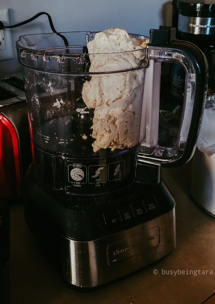 My processor has a knead dough function, so I decided to use it this time. I mixed it until the dough was no longer sticky (sides of my bowl were clear) – took maybe 2 minutes.