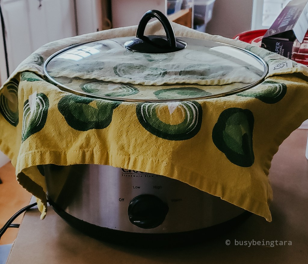 9. Cover the dough with the towel and lid again. Set the slow cooker on the high setting and cook for 1-2 hours.