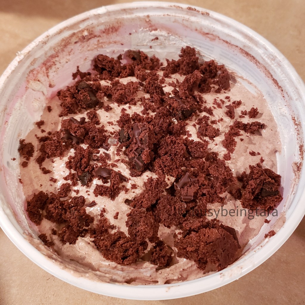 Pour the mix back into the Cool Whip container and crumble the second brownie on top.
