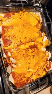 I decided to try my hand at my own enchilada recipe, and I was very pleased with the results! This recipe makes about 12 enchiladas, so plenty of left overs!