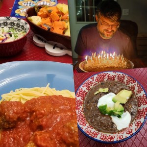 It was my partner’s birthday yesterday, and we celebrated with his mom. She brought dinner and the cake: black bean soup, salad, oven-baked sweet potatoes, spaghetti & meatballs and German chocolate cake. We weren’t going to have a birthday party like we have had the past 7 years but then decided we wanted to invite a few friends over next Saturday. It’ll be our usual celebration: dinner, cake and some type of board or card game. It’s been a while since we’ve hung out with friends.